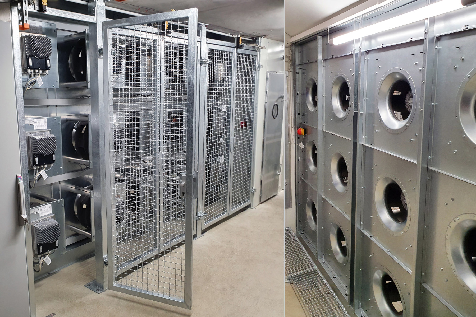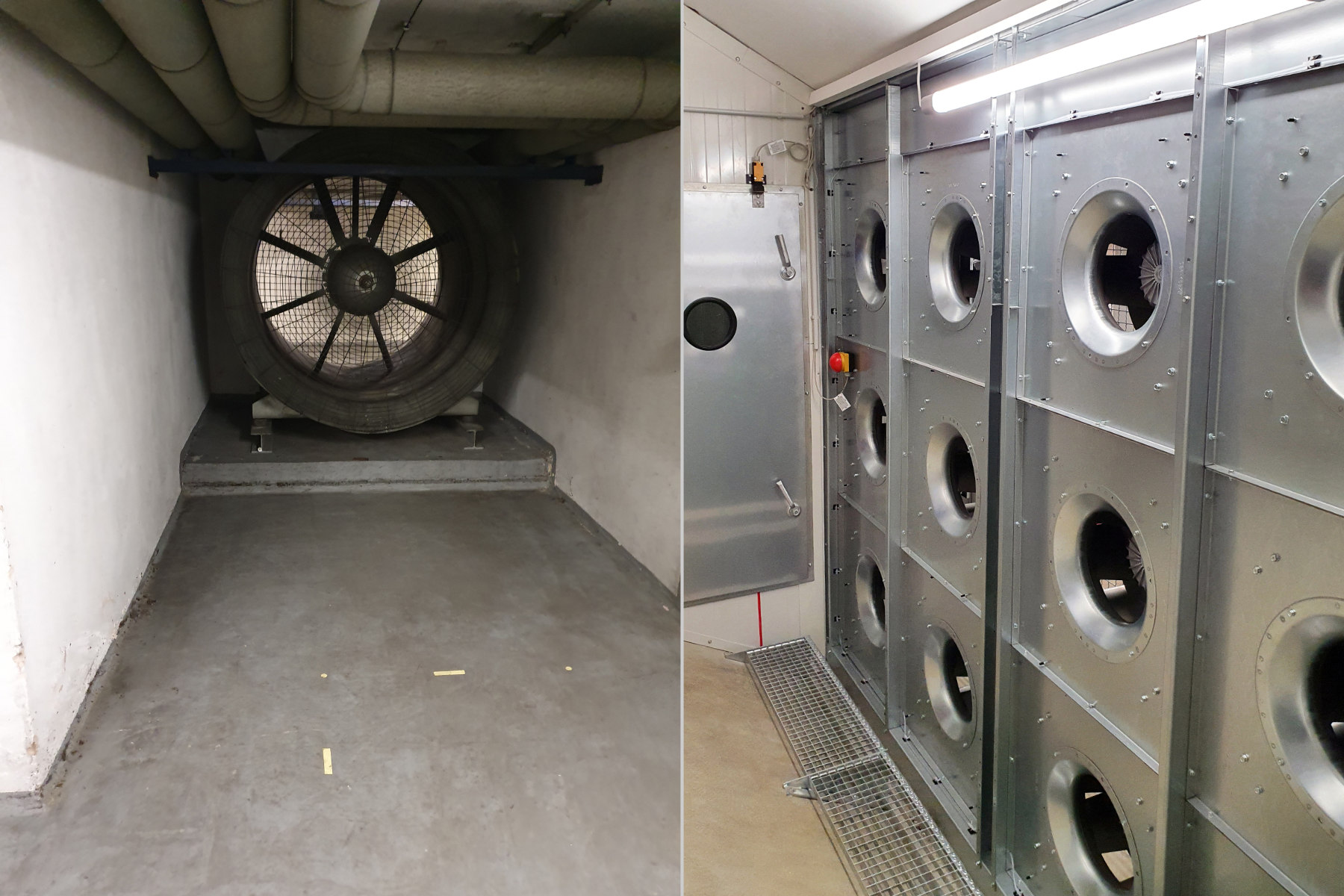 Insgesamt wurden 33 Ventilatoren des Typs GKHF 450-CEG.128.6IF eingesetzt. Die neue Anlage fördert nun 252.000 m³/h (850 Pa) Luft und kann im Bedarfsfall 300.000 m³/h (1.180 Pa) erreichen. Der totale Gesamtsystemwirkungsgrad der Anlage beträgt nun 64% im 24/7 Betrieb. Eine Besonderheit war der Schrägeinbau in den vorhandenen Betonkanal. Hierfür wurden diverse Bauteile und Revisionstüren individuell nach Maß angefertigt.