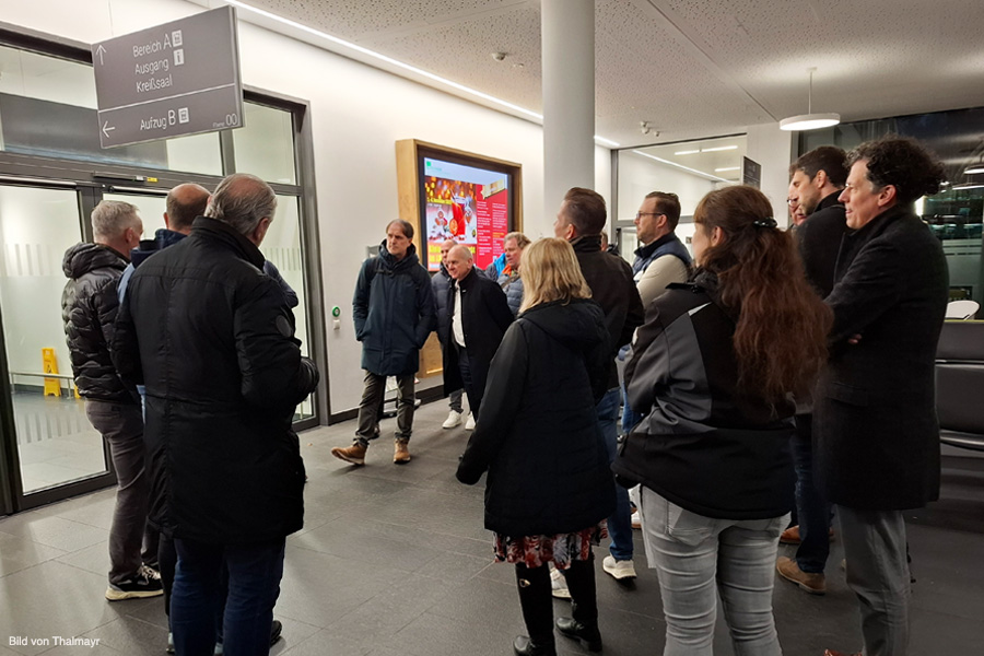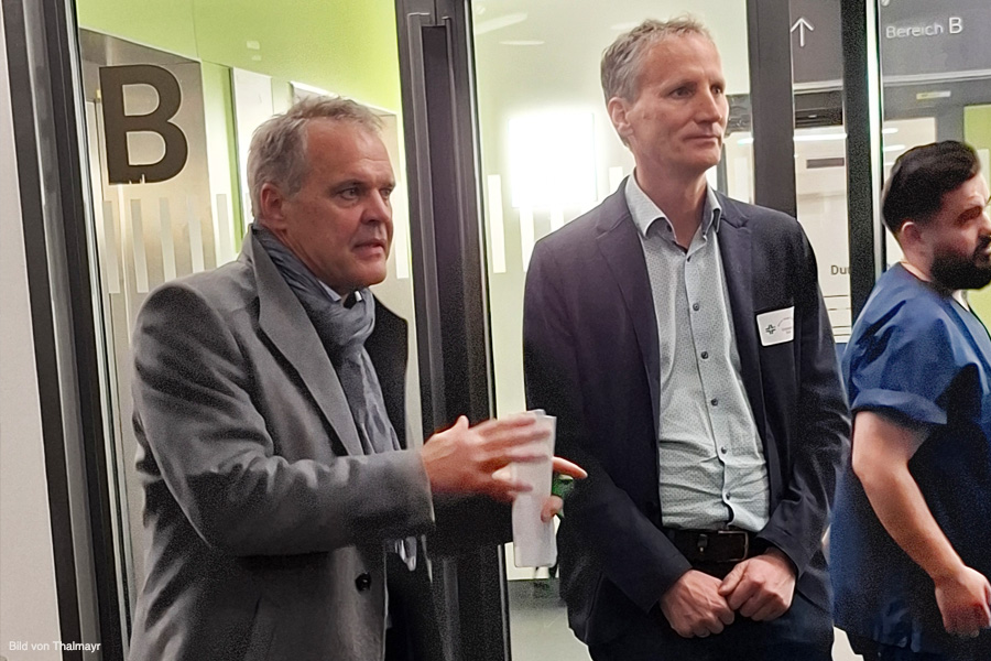 Bei einer anschließenden Führung durch das 2021 eröffnete Innenstandklinikum des LMU Klinikums München, erläuterten, Alexander Jobst, Leiter der Abteilung Bau|Technik|Liegenschaften am LMU Klinikum, und Christopher Korn, Leiter der FKT-Regionalgruppe Bayern das Gebäude und seine Funktionalitäten.