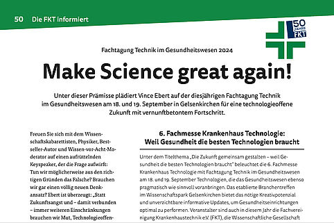 Für einzelne Häuser, ja selbst Nationen ist die anstehende Technologieentwicklung im Gesundheitswesen nicht zu stemmen. Das unerlässliche Teilen von Wissen und Erfahrungen macht die Fachvereinigung Krankenhaustechnik e.V. (FKT) heute so unverzichtbar wie bei ihrer Gründung vor 50 Jahren.