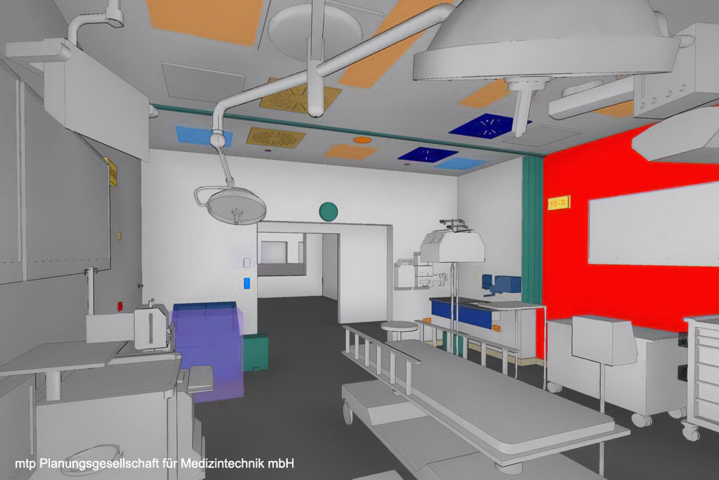 „Neben größeren Elementen wie OP-Leuchten, Patientenbetten, Deckenversorgungseinheiten oder medizinischen Großgeräten fließen in der Medizintechnik sehr viele Elemente in die Planung ein, die für eine Darstellung im 3D-Modell zu klein oder nicht relevant sind: Infusionspumpen, Monitore, Wärmedecken – alles, was man von links nach rechts tragen kann“, erklärt Hanke. Diese Elemente sind zwar klein, aber dennoch sehr wichtig für die MT-Planung. Sie brauchen Platz, Strom oder andere Medien und können häufig ein Vielfaches der Kosten von „sichtbaren“ Elementen ausmachen. MTP hat deshalb im Arbeitskreis Medizin- und Labortechnik gemeinsam mit einigen anderen Medizintechnikplanern einen Sonderweg erarbeitet, um Medizintechnik sinnvoll ins BIM einer Klinik integrieren zu können. Er splittet die BIM-Planungsmethode in eine Kombination aus einem 3D-Modell für Kollisionsprüfungen, zur Erstellung von 2D-Plänen sowie für 3D-Visualisierungen, … und eine separate Datenbank: das Raumbuch. Darin werden technische und planungsrelevante Informationen zu den nicht im 3D-Modell dargestellten Komponenten wie Stromverbrauch, Nennleistung, Wärmeabgabe etc. geführt. So wissen die anderen Gewerke, welche Anschlüsse, Kühlleistungen etc. an welcher Stelle für diese Kleingeräte vorgesehen werden müssen. Ins 3D-Modell fließen diese Komponenten lediglich als sogenannte Technische Übergabekörper ein.